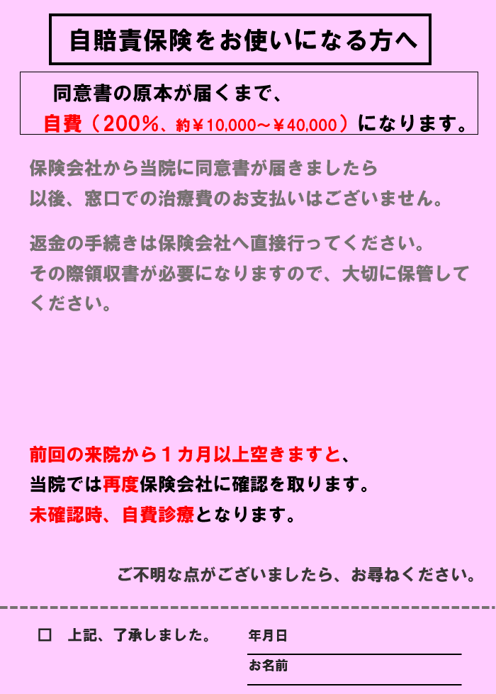 保険会社から当院に同意書が届きましたら、以後、窓口での治療費のお支払いはございません。