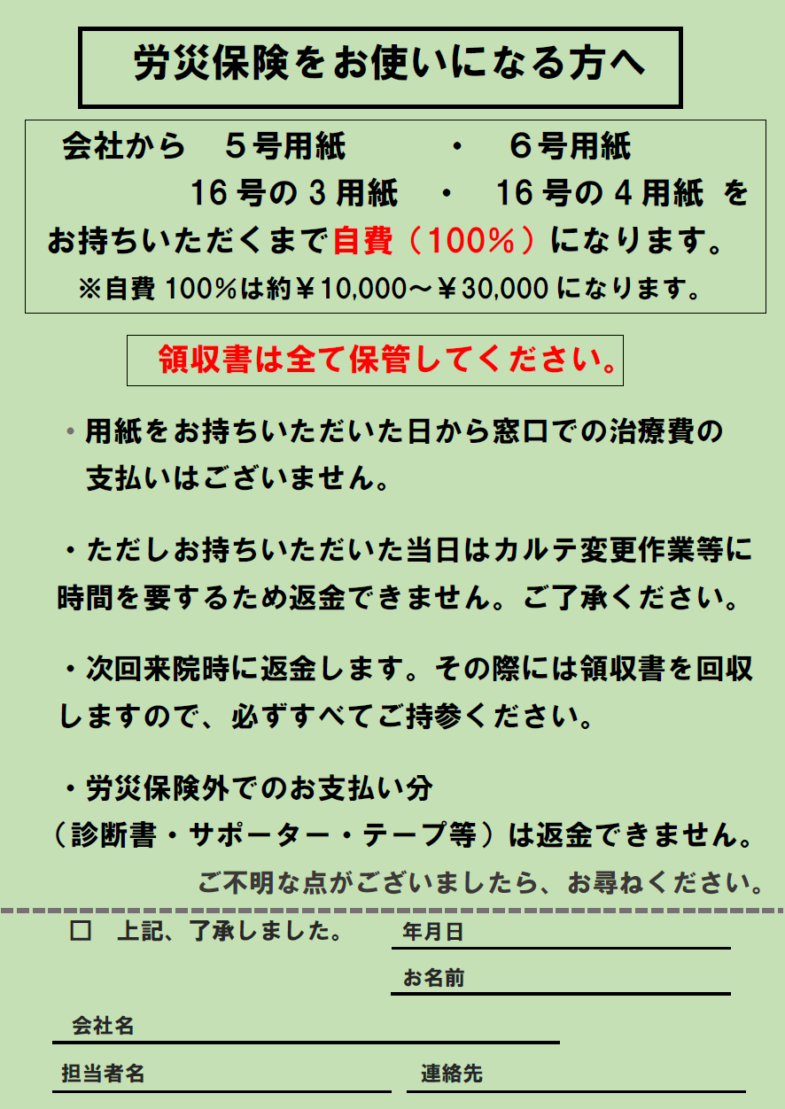 ・労災保険外でのお支払い分(診断書・サポーター・テープ等)は返金できません。